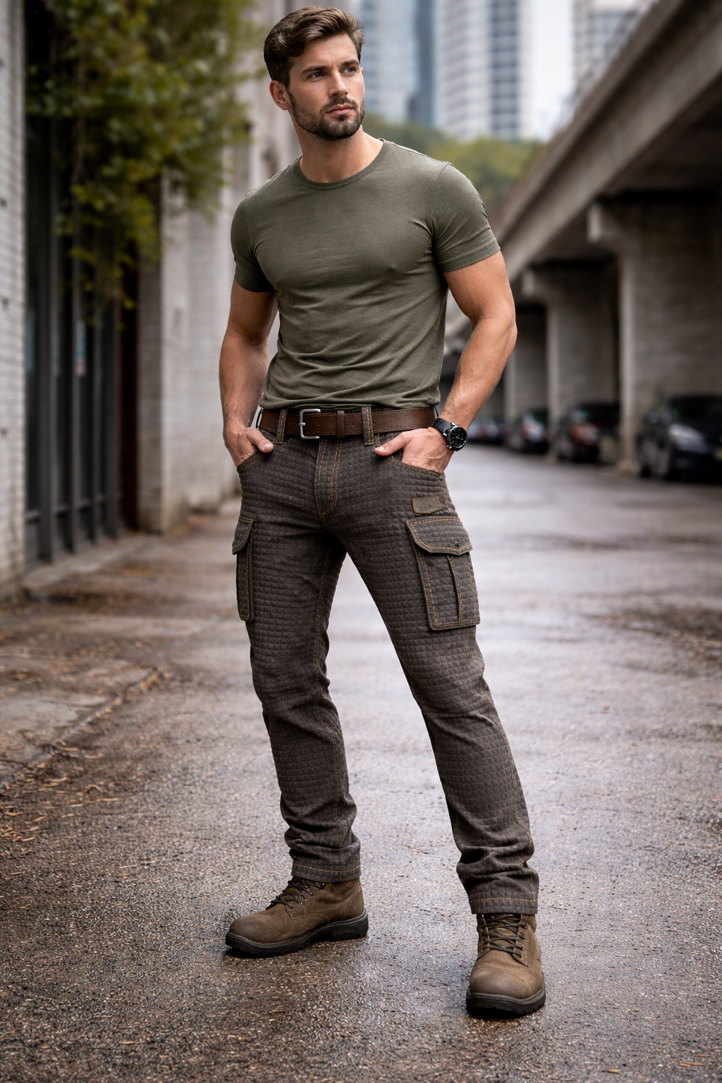 Su textura trabajada le da un aspecto moderno y decidido, mientras que el corte cargo moldea una silueta funcional, ideal tanto para el trabajo como para el fin de semana.