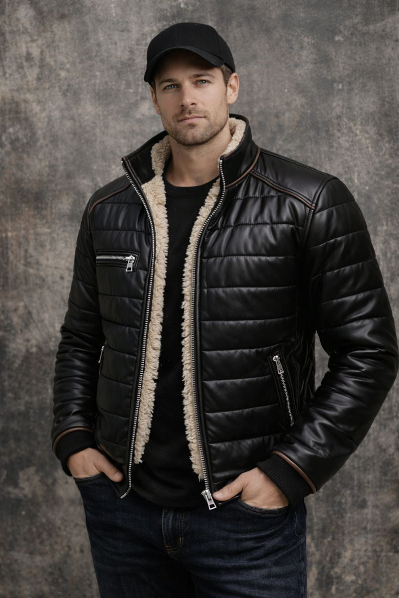 Esta chaqueta negra acolchada, forrada con un grueso sherpa de tacto ultra suave, está diseñada para ofrecer un calor excepcional mientras mantiene un aspecto moderno y decidido.