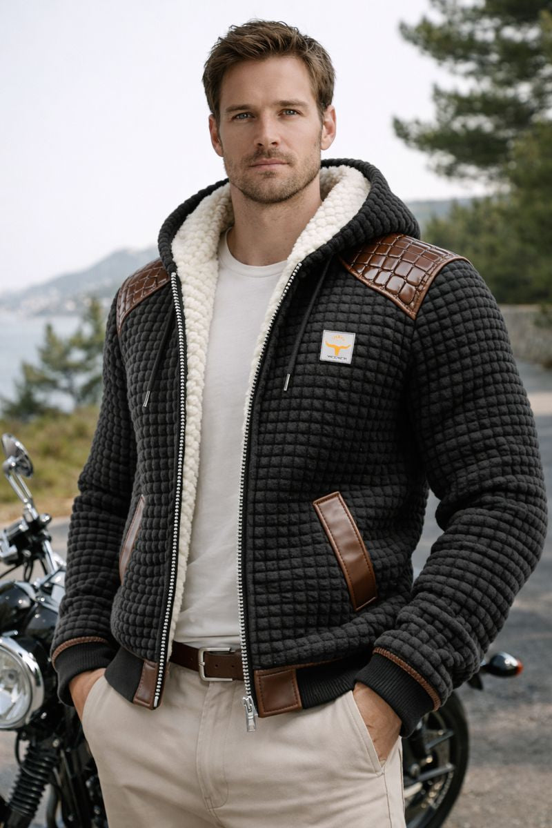 Álora™ | Chaqueta texturizada con acabados en cuero grabado combina una sensación suave y refinada con una presencia fuerte y distinguida, logrando un equilibrio natural entre sofisticación y carácter. Su rica textura y los detalles cuidadosamente trabajados aportan un estilo exclusivo y atemporal.